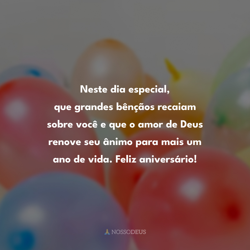 Neste dia especial, que grandes bênçãos recaiam sobre você e que o amor de Deus renove seu ânimo para mais um ano de vida. Feliz aniversário! Saiba que é com muita fé que lhe desejo as mais incríveis realizações.