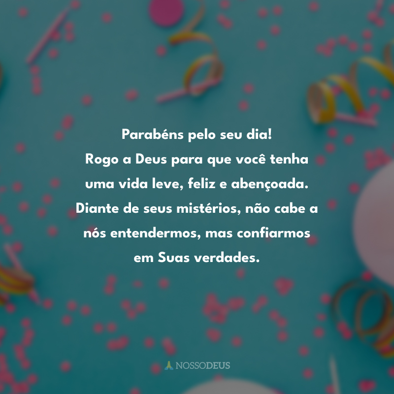 Parabéns pelo seu dia! Rogo a Deus para que você tenha uma vida leve, feliz e abençoada. Diante de seus mistérios, não cabe a nós entendermos, mas confiarmos em Suas verdades.