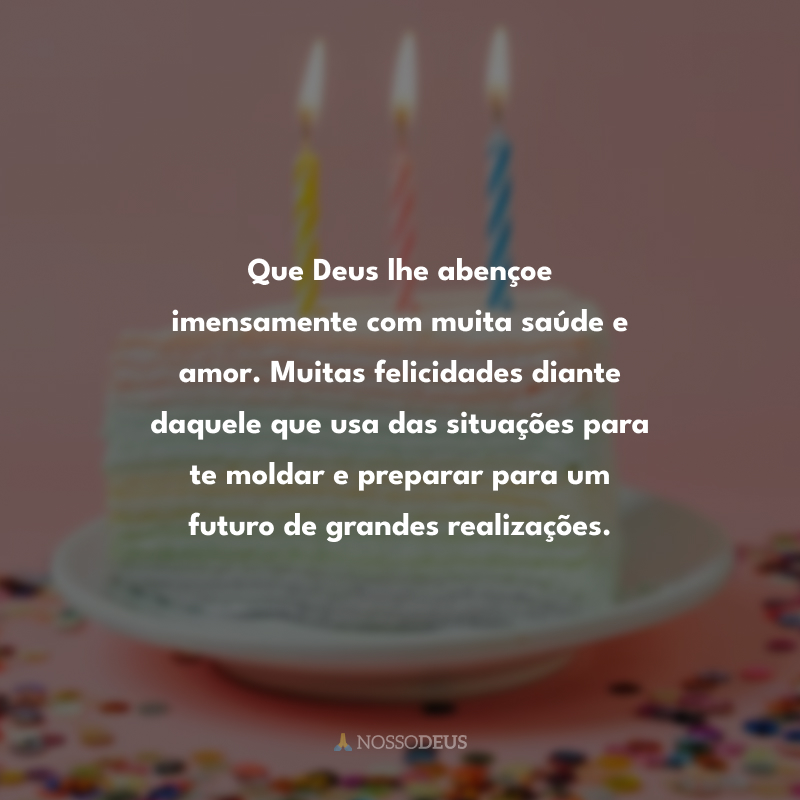 Feliz aniversário! Que Deus lhe abençoe imensamente com muita saúde e amor. Muitas felicidades diante daquele que usa das situações para te moldar e preparar para um futuro de grandes realizações.