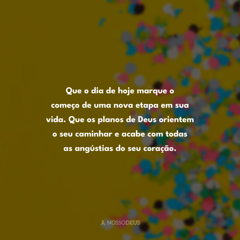 Que o dia de hoje marque o começo de uma nova etapa em sua vida. Que os planos de Deus orientem o seu caminhar e acabe com todas as angústias do seu coração. Feliz e abençoado aniversário!