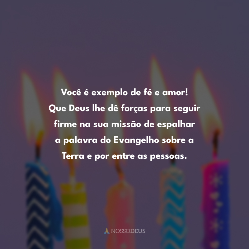 Você é exemplo de fé e amor! Que Deus lhe dê forças para seguir firme na sua missão de espalhar a palavra do Evangelho sobre a Terra e por entre as pessoas. Feliz aniversário!