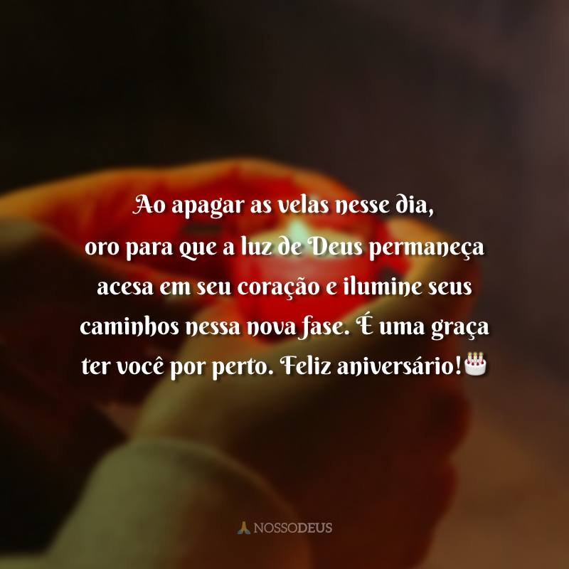 Ao apagar as velas nesse dia, oro para que a luz de Deus permaneça acesa em seu coração e ilumine seus caminhos nessa nova fase. É uma graça ter você por perto. Feliz aniversário!🎂