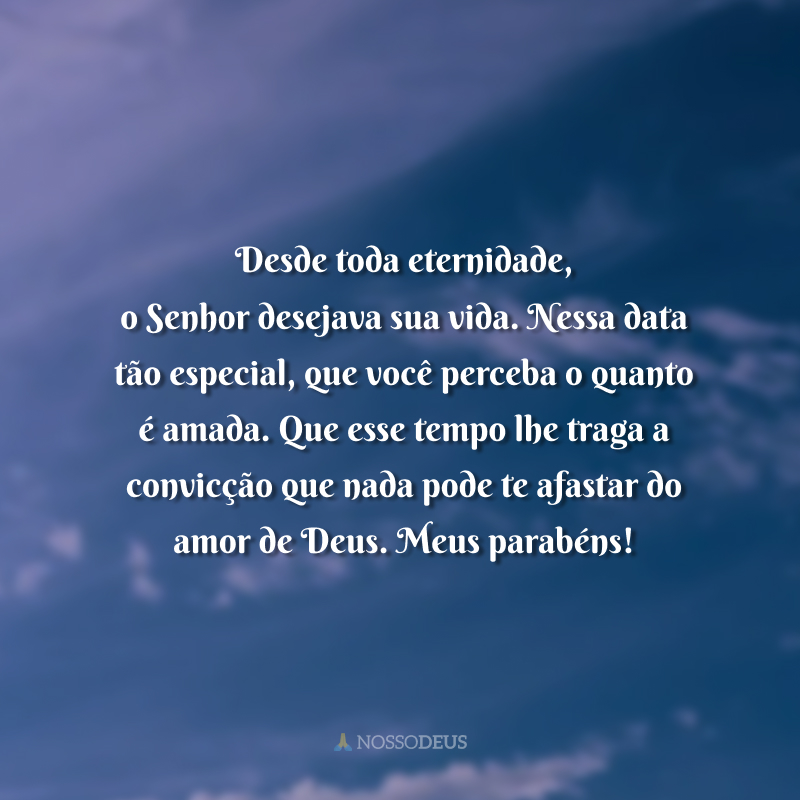 Desde toda eternidade, o Senhor desejava sua vida. Nessa data tão especial, que você perceba o quanto é amada. Que esse tempo lhe traga a convicção que nada pode te afastar do amor de Deus. Meus parabéns!