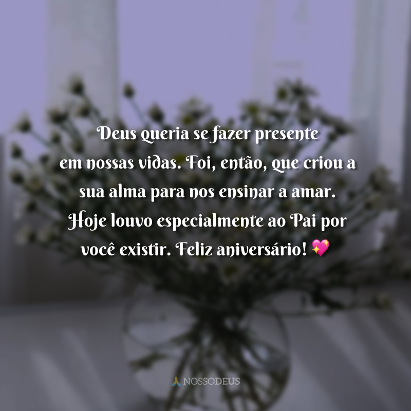 Deus queria se fazer presente em nossas vidas. Foi, então, que criou a sua alma para nos ensinar a amar. Hoje louvo especialmente ao Pai por você existir. Feliz aniversário! 💖