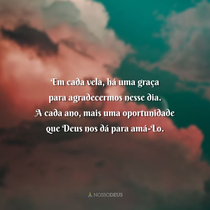 Em cada vela, há uma graça para agradecermos nesse dia. A cada ano, mais uma oportunidade que Deus nos dá para amá-Lo. Que o Senhor permaneça te sustentando na fé, movendo montanhas em sua vida e preparando cada detalhe dessa nova idade. Feliz aniversário!