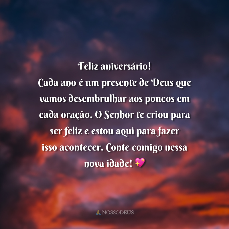 Feliz aniversário! Cada ano é um presente de Deus que vamos desembrulhar aos poucos em cada oração. O Senhor te criou para ser feliz e estou aqui para fazer isso acontecer. Conte comigo nessa nova idade!💖