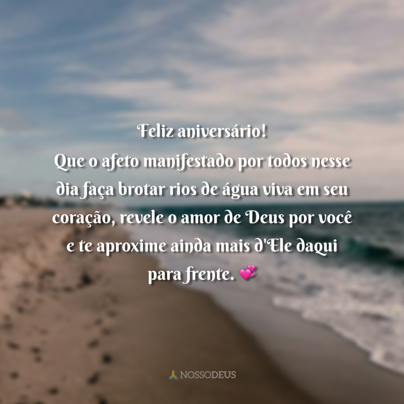 Feliz aniversário! Que o afeto manifestado por todos nesse dia faça brotar rios de água viva em seu coração, revele o amor de Deus por você e te aproxime ainda mais d'Ele daqui para frente. 💞