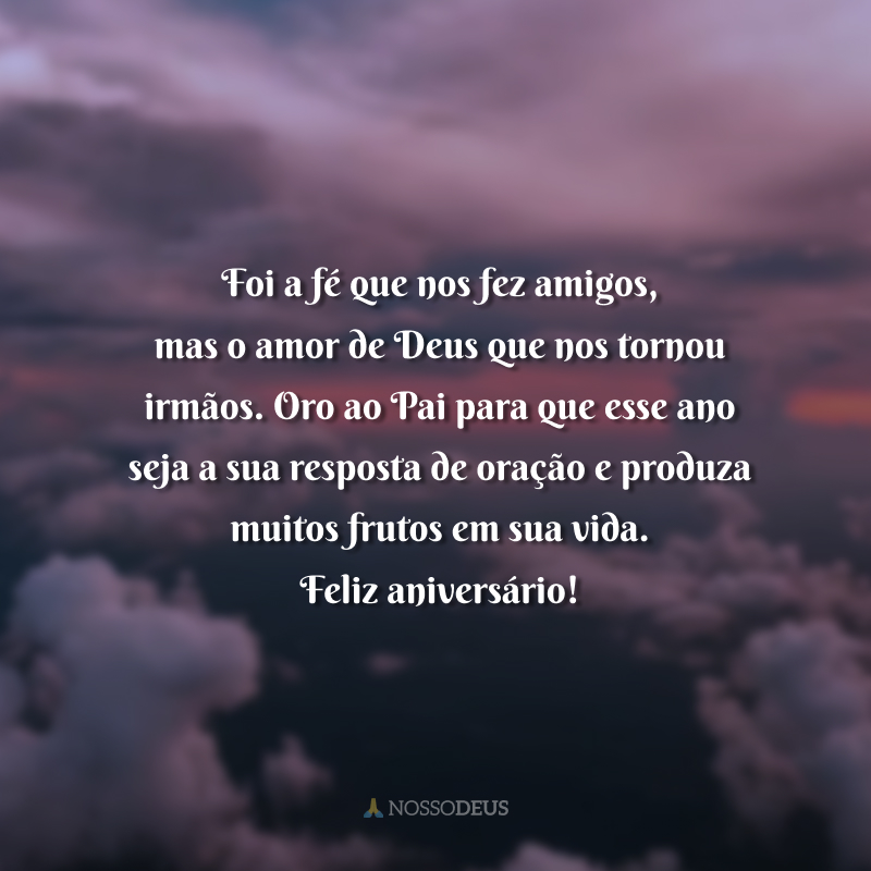 Foi a fé que nos fez amigos, mas o amor de Deus que nos tornou irmãos. Oro ao Pai para que esse ano seja a sua resposta de oração e produza muitos frutos em sua vida. Feliz aniversário!