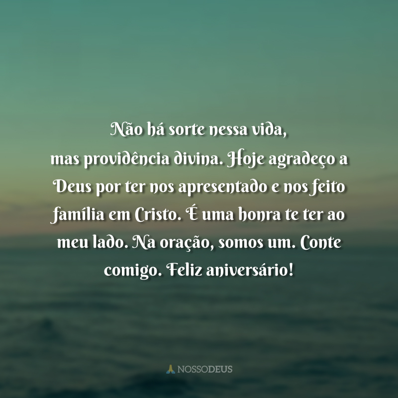 Não há sorte nessa vida, mas providência divina. Hoje agradeço a Deus por ter nos apresentado e nos feito família em Cristo. É uma honra te ter ao meu lado. Na oração, somos um. Conte comigo. Feliz aniversário!