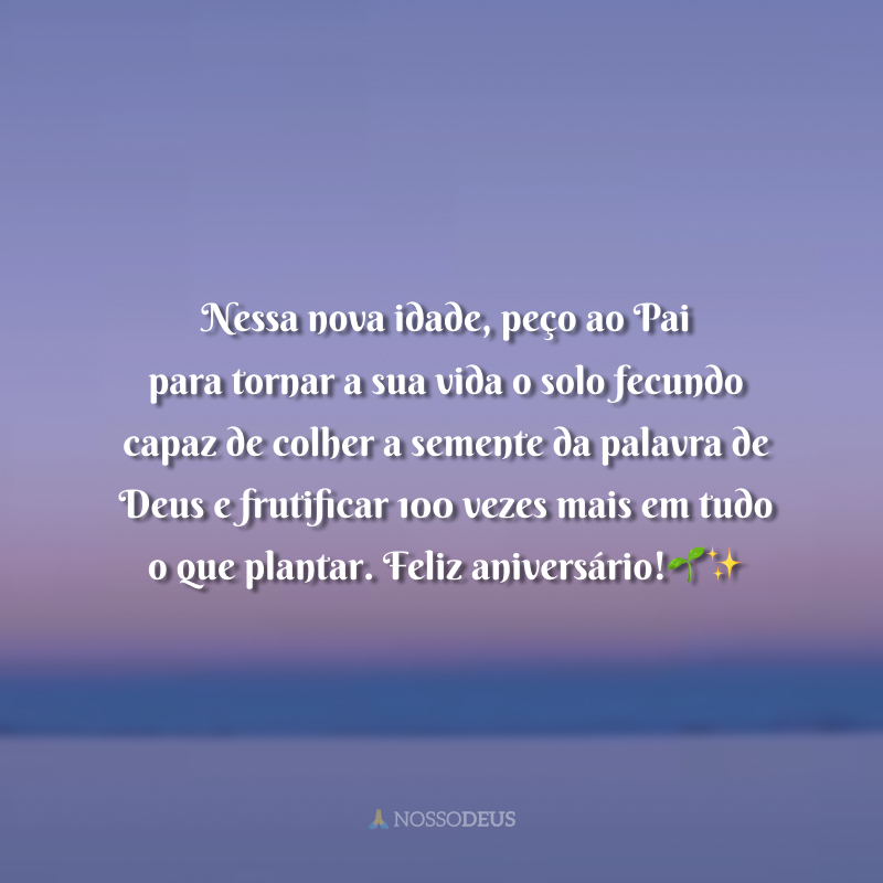 Nessa nova idade, peço ao Pai para tornar a sua vida o solo fecundo capaz de colher a semente da palavra de Deus e frutificar 100 vezes mais em tudo o que plantar. Feliz aniversário!🌱✨