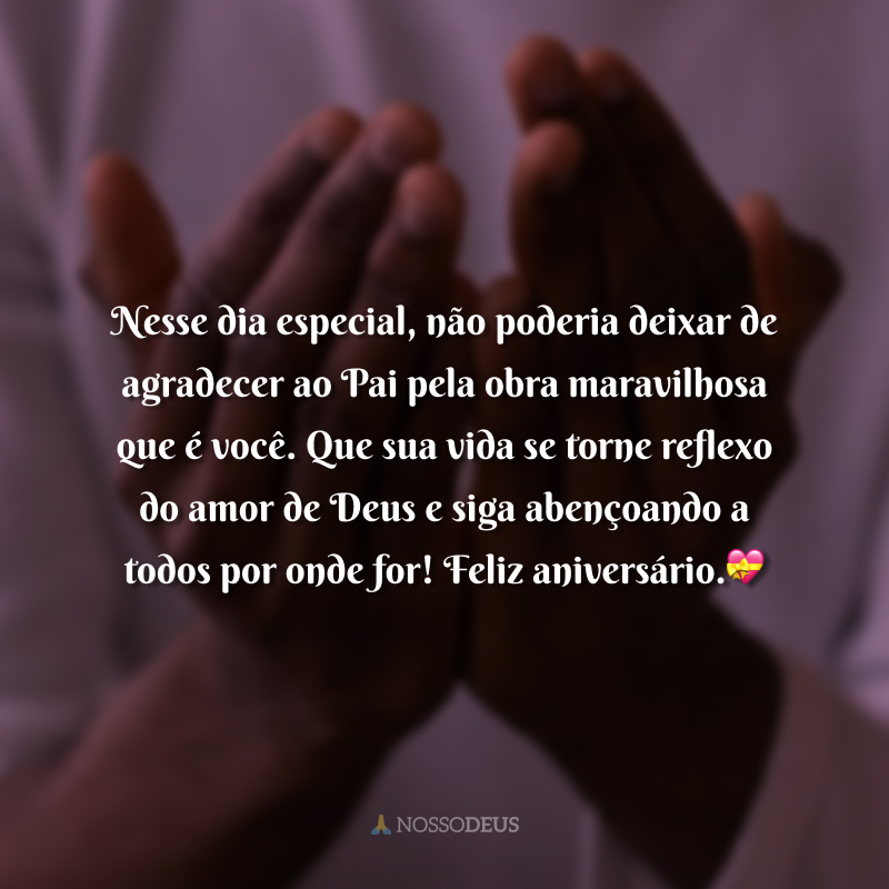 Nesse dia especial, não poderia deixar de agradecer ao Pai pela obra maravilhosa que é você. Que sua vida se torne reflexo do amor de Deus e siga abençoando a todos por onde for! Feliz aniversário.💝
