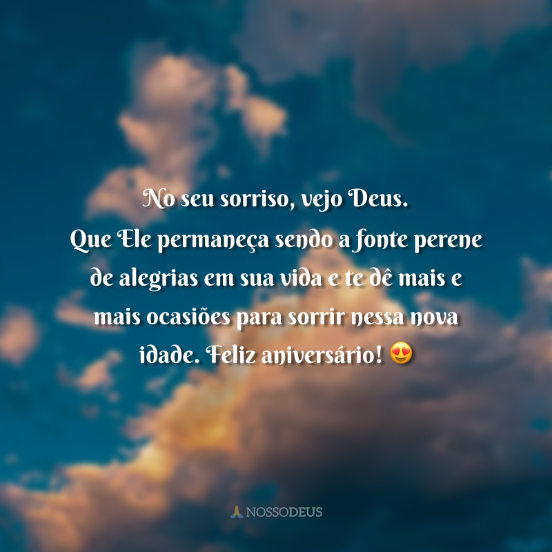 No seu sorriso, vejo Deus. Que Ele permaneça sendo a fonte perene de alegrias em sua vida e te dê mais e mais ocasiões para sorrir nessa nova idade. Feliz aniversário! 😍