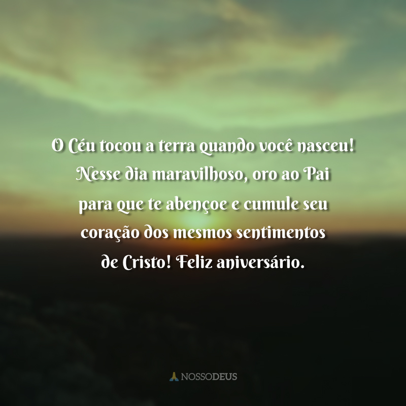 O Céu tocou a terra quando você nasceu! Nesse dia maravilhoso, oro ao Pai para que te abençoe e cumule seu coração dos mesmos sentimentos de Cristo! Feliz aniversário.