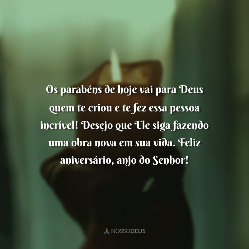 Os parabéns de hoje vai para Deus quem te criou e te fez essa pessoa incrível! Desejo que Ele siga fazendo uma obra nova em sua vida. Feliz aniversário, anjo do Senhor!