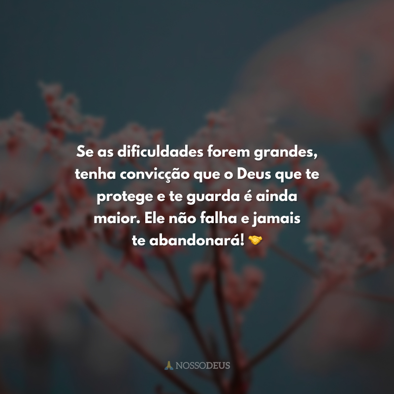 Se as dificuldades forem grandes, tenha convicção que o Deus que te protege e te guarda é ainda maior. Ele não falha e jamais te abandonará! 🤝