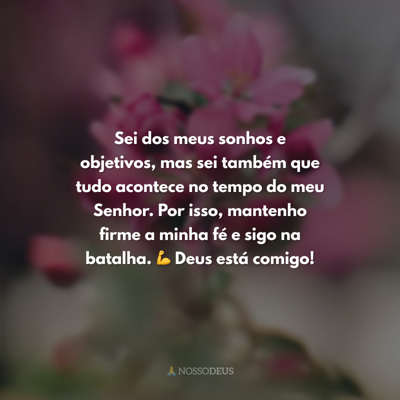 Sei dos meus sonhos e objetivos, mas sei também que tudo acontece no tempo do meu Senhor. Por isso, mantenho firme a minha fé e sigo na batalha. 💪 Deus está comigo!