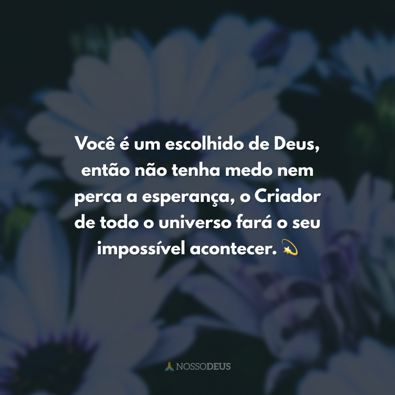Você é um escolhido de Deus, então não tenha medo nem perca a esperança, o Criador de todo o universo fará o seu impossível acontecer. 💫