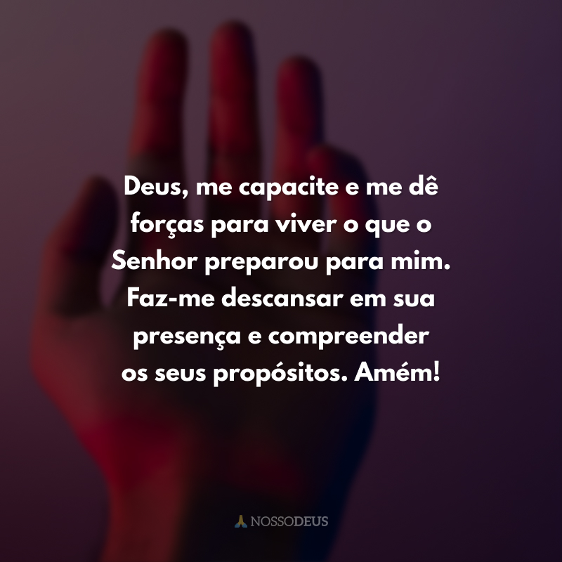 Deus, me capacite e me dê forças para viver o que o Senhor preparou para mim. Faz-me descansar em sua presença e compreender os seus propósitos. Amém!