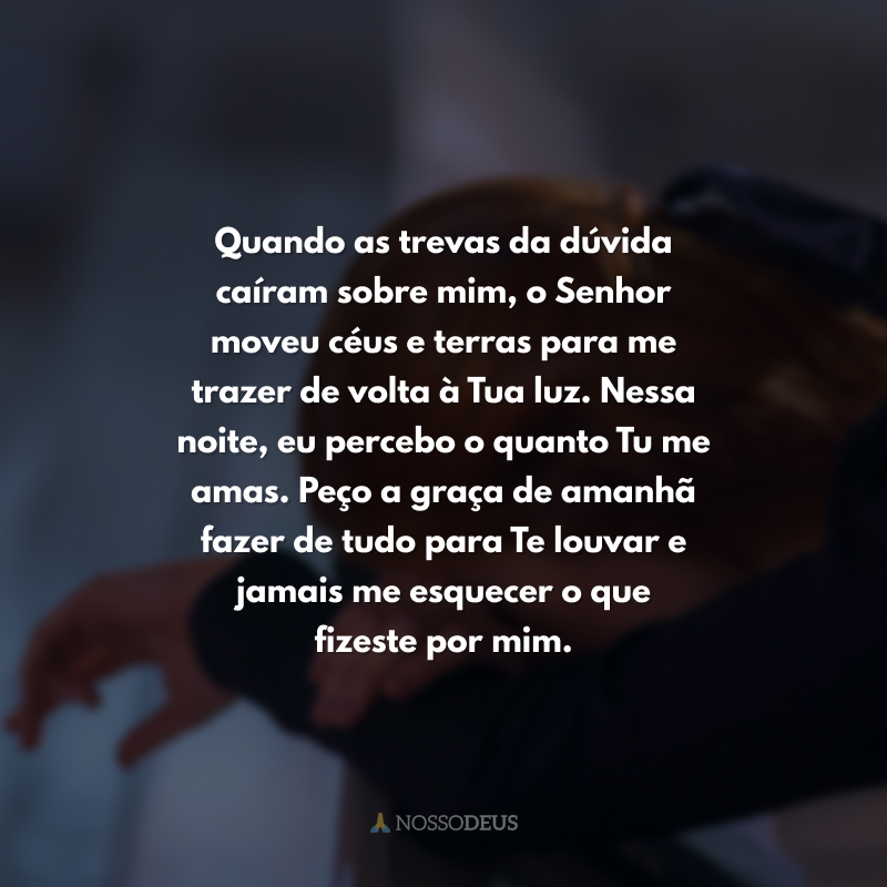 Quando as trevas da dúvida caíram sobre mim, o Senhor moveu céus e terras para me trazer de volta à Tua luz. Nessa noite, eu percebo o quanto Tu me amas. Peço a graça de amanhã fazer de tudo para Te louvar e jamais me esquecer o que fizeste por mim.