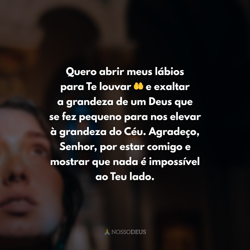 Quero abrir meus lábios para Te louvar🤲 e exaltar a grandeza de um Deus que se fez pequeno para nos elevar à grandeza do Céu. Agradeço, Senhor, por estar comigo e mostrar que nada é impossível ao Teu lado.