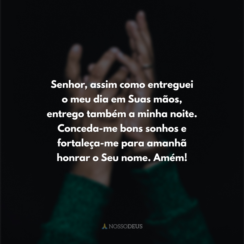 Senhor, assim como entreguei o meu dia em Suas mãos, entrego também a minha noite. Conceda-me bons sonhos e fortaleça-me para amanhã honrar o Seu nome. Amém!
