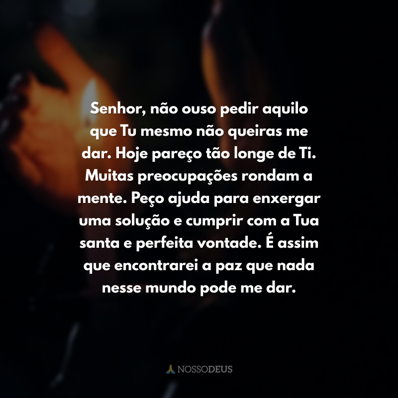 Senhor, não ouso pedir aquilo que Tu mesmo não queiras me dar. Hoje pareço tão longe de Ti. Muitas preocupações rondam a mente. Peço ajuda para enxergar uma solução e cumprir com a Tua santa e perfeita vontade. É assim que encontrarei a paz que nada nesse mundo pode me dar.