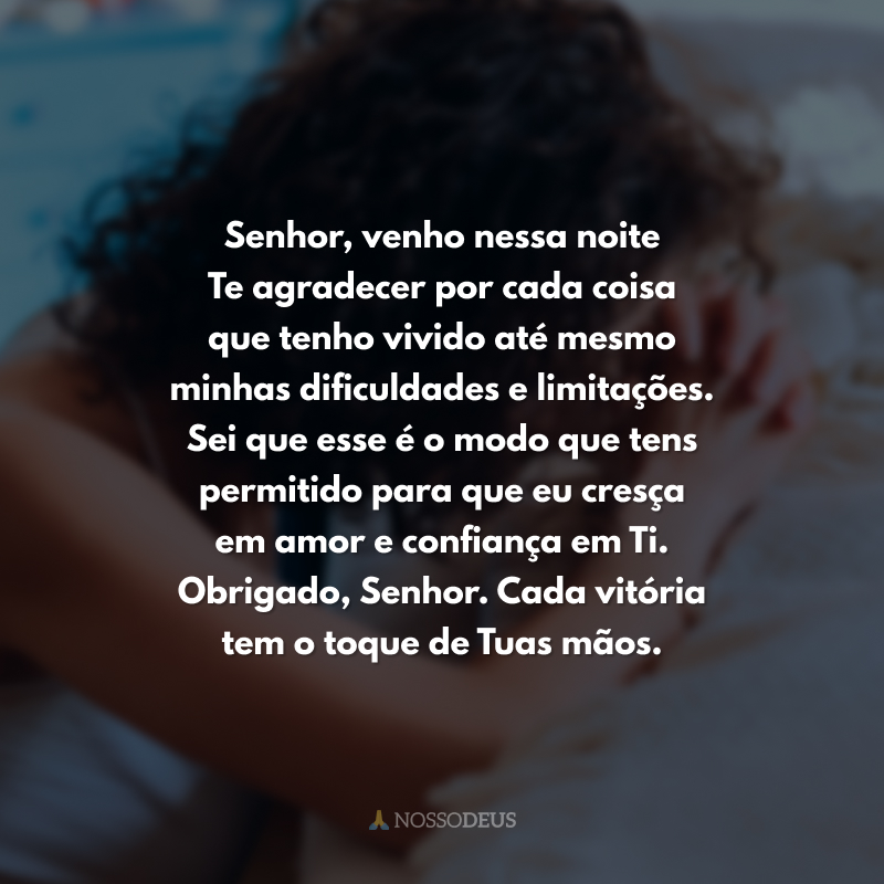 Senhor, venho nessa noite Te agradecer por cada coisa que tenho vivido até mesmo minhas dificuldades e limitações. Sei que esse é o modo que tens permitido para que eu cresça em amor e confiança em Ti. Obrigado, Senhor. Cada vitória tem o toque de Tuas mãos.