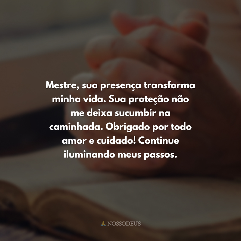 Mestre, sua presença transforma minha vida. Sua proteção não me deixa sucumbir na caminhada. Obrigado por todo amor e cuidado! Continue iluminando meus passos.