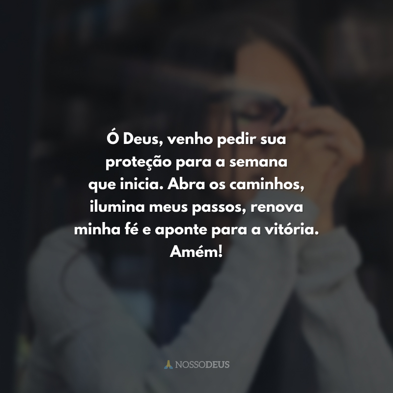 Ó Deus, venho pedir sua proteção para a semana que inicia. Abra os caminhos, ilumina meus passos, renova minha fé e aponte para a vitória. Amém!