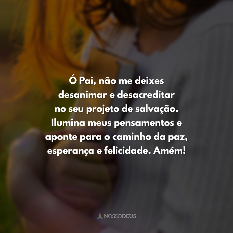 Ó Pai, não me deixes desanimar e desacreditar no seu projeto de salvação. Ilumina meus pensamentos e aponte para o caminho da paz, esperança e felicidade. Amém!