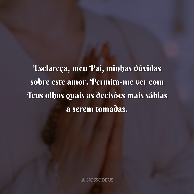 Esclareça, meu Pai, minhas dúvidas sobre este amor. Permita-me ver com Teus olhos quais as decisões mais sábias a serem tomadas.