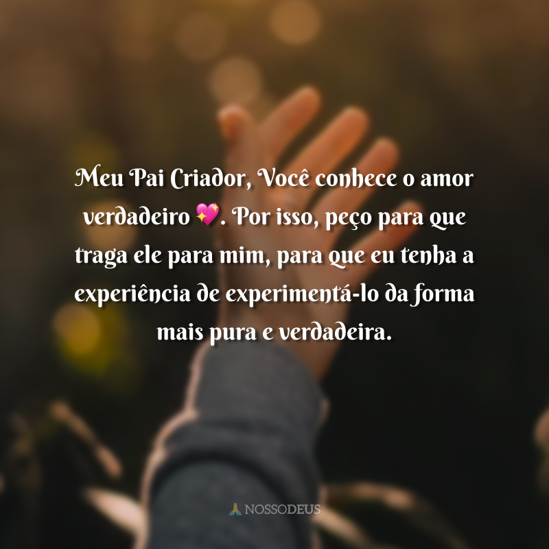 Meu Pai Criador, Você conhece o amor verdadeiro 💖. Por isso, peço para que traga ele para mim, para que eu tenha a experiência de experimentá-lo da forma mais pura e verdadeira.