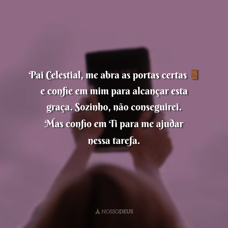 Pai Celestial, me abra as portas certas 🚪 e confie em mim para alcançar esta graça. Sozinho, não conseguirei. Mas confio em Ti para me ajudar nessa tarefa.