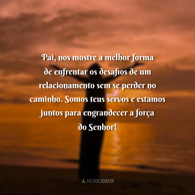 Pai, nos mostre a melhor forma de enfrentar os desafios de um relacionamento sem se perder no caminho. Somos teus servos e estamos juntos para engrandecer a força do Senhor!