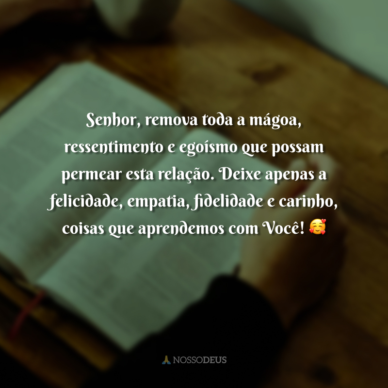 Senhor, remova toda a mágoa, ressentimento e egoísmo que possam permear esta relação. Deixe apenas a felicidade, empatia, fidelidade e carinho, coisas que aprendemos com Você! 🥰