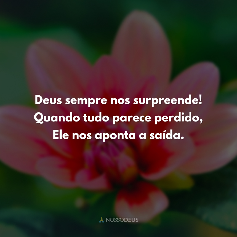 Em Cristo encontramos um coração misericordioso para semearmos nossos sonhos. Sua bondade e compaixão o leva a assumir nossos planos como projetos seus. Diariamente somos surpreendidos pelo seu amor. Por isso, separamos lindas frases de surpresa de Deus para celebrar o poder transformador que vêm d’Ele. Compartilhe e celebre as maravilhas do Pai!