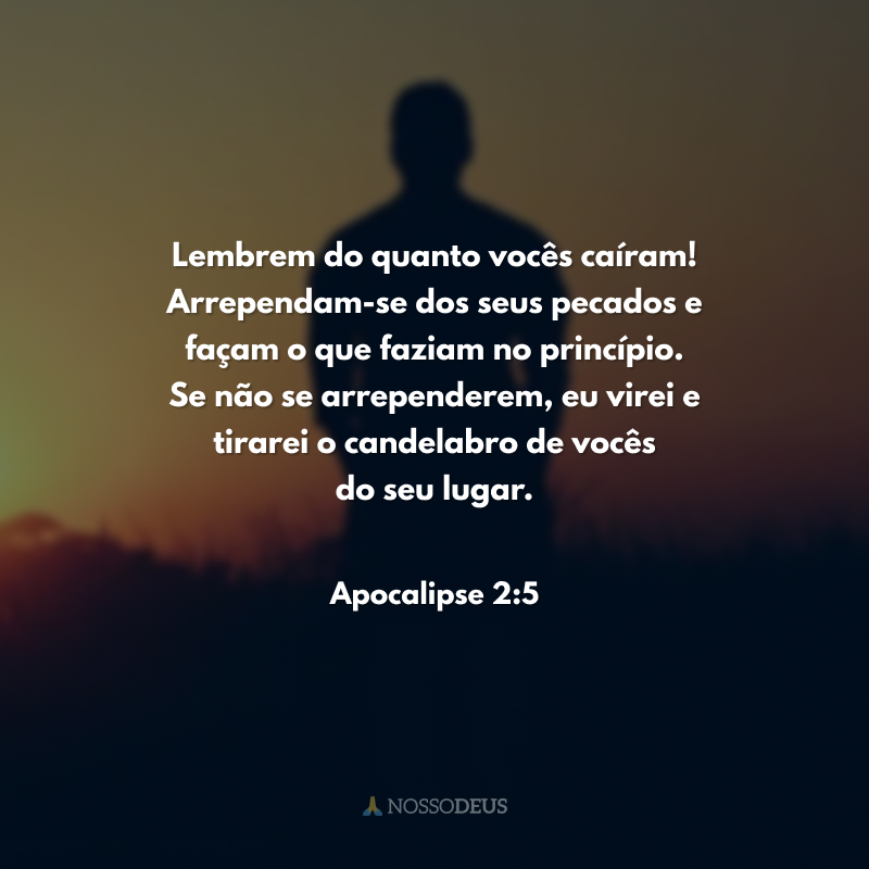 Lembrem do quanto vocês caíram! Arrependam-se dos seus pecados e façam o que faziam no princípio. Se não se arrependerem, eu virei e tirarei o candelabro de vocês do seu lugar.