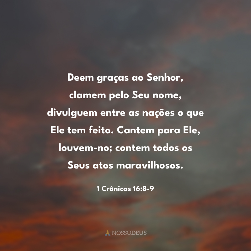 Deem graças ao Senhor, clamem pelo Seu nome, divulguem entre as nações o que Ele tem feito. Cantem para Ele, louvem-no; contem todos os Seus atos maravilhosos.