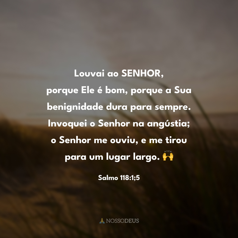 Louvai ao SENHOR, porque Ele é bom, porque a Sua benignidade dura para sempre. Invoquei o Senhor na angústia; o Senhor me ouviu, e me tirou para um lugar largo. 🙌