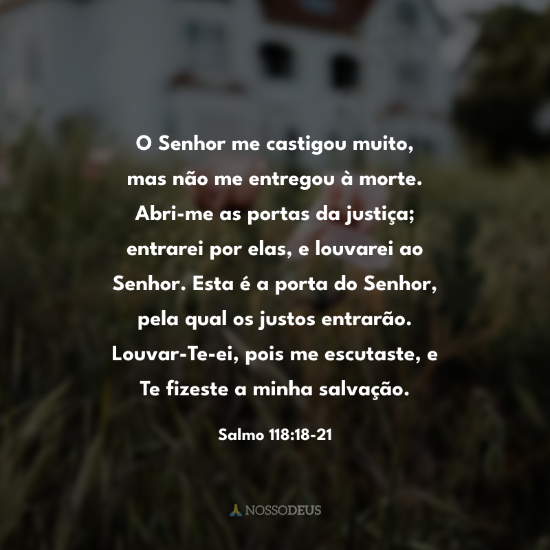 O Senhor me castigou muito, mas não me entregou à morte. Abri-me as portas da justiça; entrarei por elas, e louvarei ao Senhor. Esta é a porta do Senhor, pela qual os justos entrarão. Louvar-Te-ei, pois me escutaste, e Te fizeste a minha salvação.