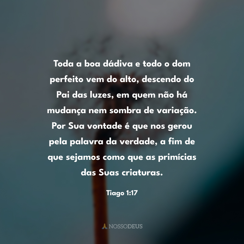 Toda a boa dádiva e todo o dom perfeito vem do alto, descendo do Pai das luzes, em quem não há mudança nem sombra de variação. Por Sua vontade é que nos gerou pela palavra da verdade, a fim de que sejamos como que as primícias das Suas criaturas.