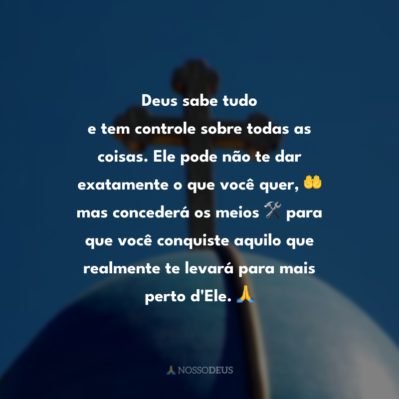 Deus sabe tudo e tem controle sobre todas as coisas. Ele pode não te dar exatamente o que você quer, 🤲 mas concederá os meios 🛠 para que você conquiste aquilo que realmente te levará para mais perto d'Ele. 🙏