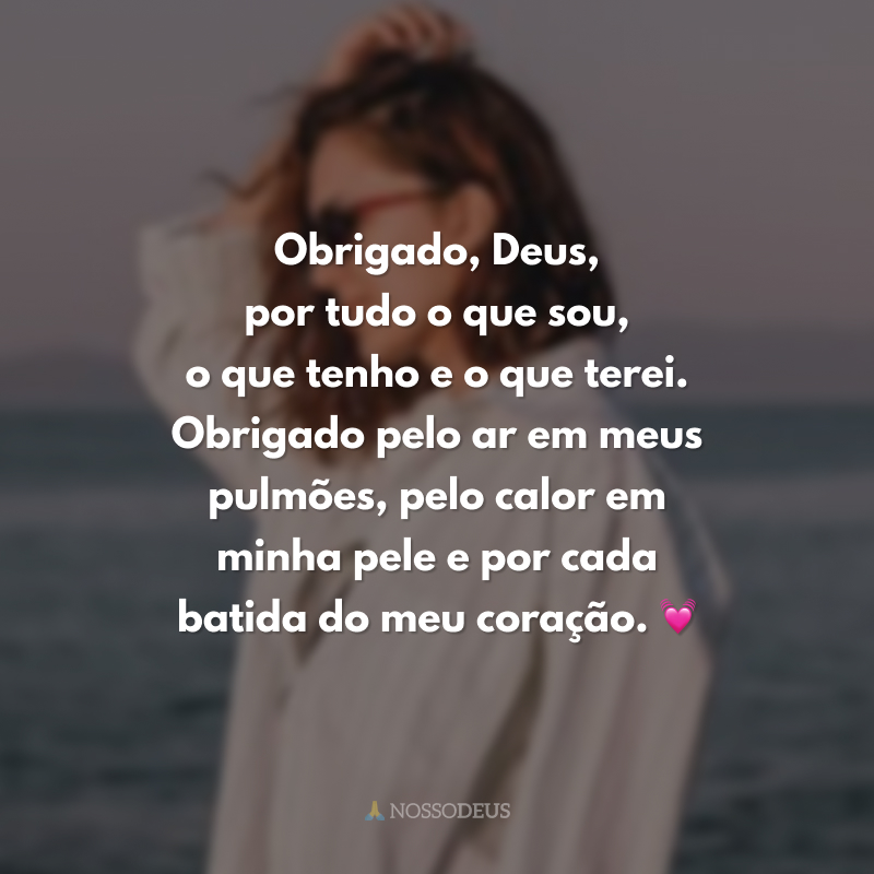 Obrigado, Deus, por tudo o que sou, o que tenho e o que terei. Obrigado pelo ar em meus pulmões, pelo calor em minha pele e por cada batida do meu coração. 💓