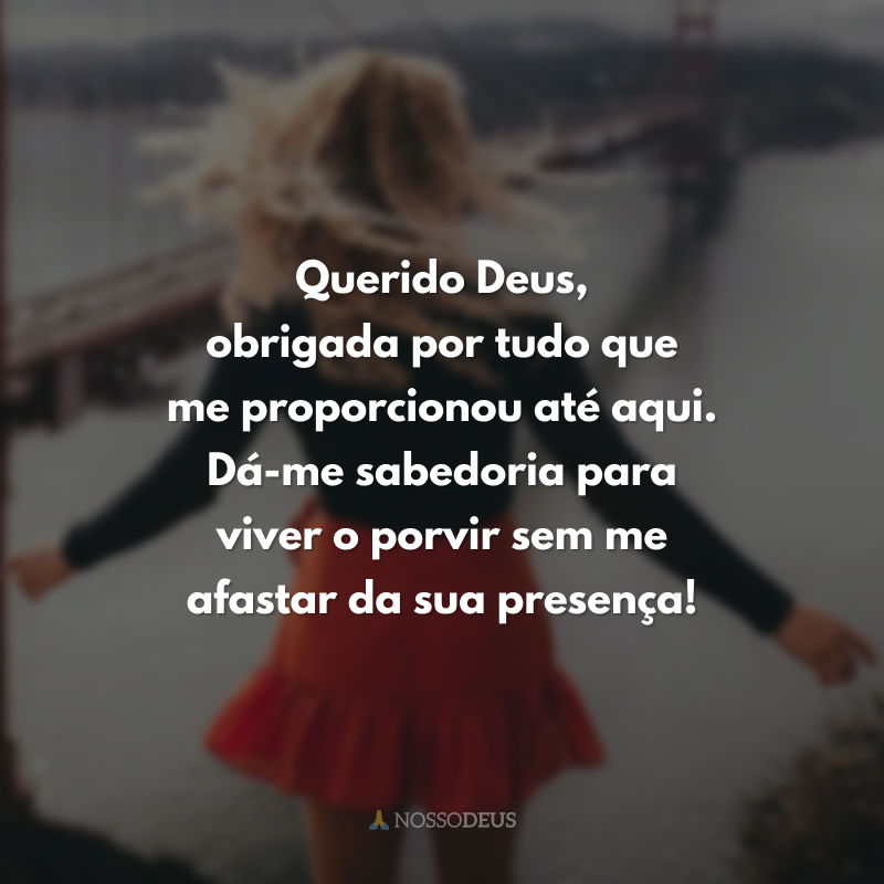 Querido Deus, obrigada por tudo que me proporcionou até aqui. Dá-me sabedoria para viver o porvir sem me afastar da sua presença!