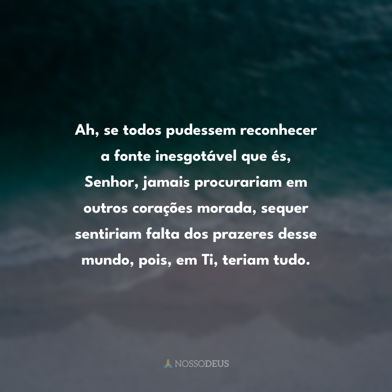 Ah, se todos pudessem reconhecer a fonte inesgotável que és, Senhor, jamais procurariam em outros corações morada, sequer sentiriam falta dos prazeres desse mundo, pois, em Ti, teriam tudo.