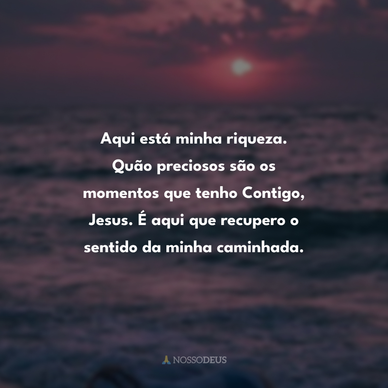 Aqui está minha riqueza. Quão preciosos são os momentos que tenho Contigo, Jesus. É aqui que recupero o sentido da minha caminhada. Eu me despojo de todas as minhas seguranças para que sejas Tu a minha única certeza que jamais se acabará. Nada tenho de valor senão Tu, pois, tendo a Ti, tenho tudo.