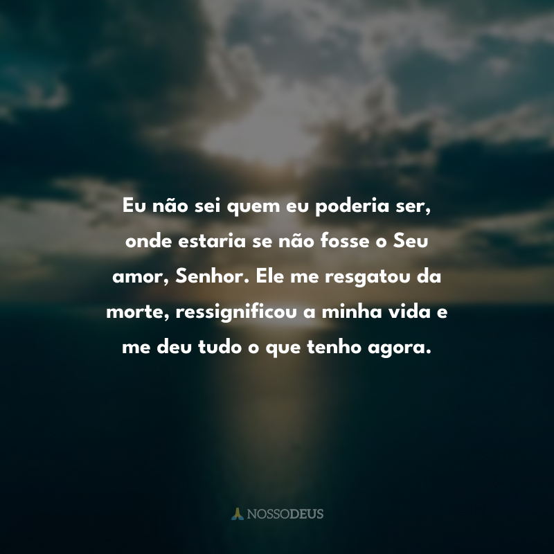 Eu não sei quem eu poderia ser, onde estaria se não fosse o Seu amor, Senhor. Ele me resgatou da morte, ressignificou a minha vida e me deu tudo o que tenho agora. Benditas sejam as quedas que me levaram a Você, Jesus, meu Mestre e Senhor. Se sou livre, é porque Você mesmo me libertou e me perdoou e hoje me envia como sinal do Seu imenso amor. Eu Te adoro e quero proclamar todas as maravilhas que tem feito em mim.