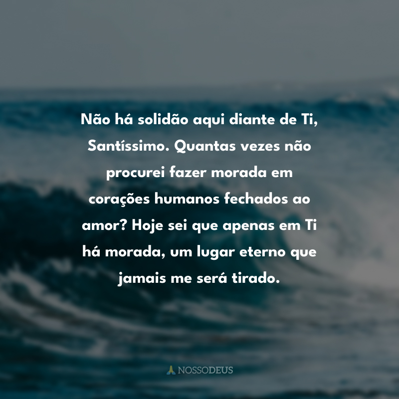 Não há solidão aqui diante de Ti, Santíssimo. Quantas vezes não procurei fazer morada em corações humanos fechados ao amor? Hoje sei que apenas em Ti há morada, um lugar eterno que jamais me será tirado. Obrigada por me dar não apenas um lar, mas a certeza de que sempre o Teu amor existe e me faz existir.
