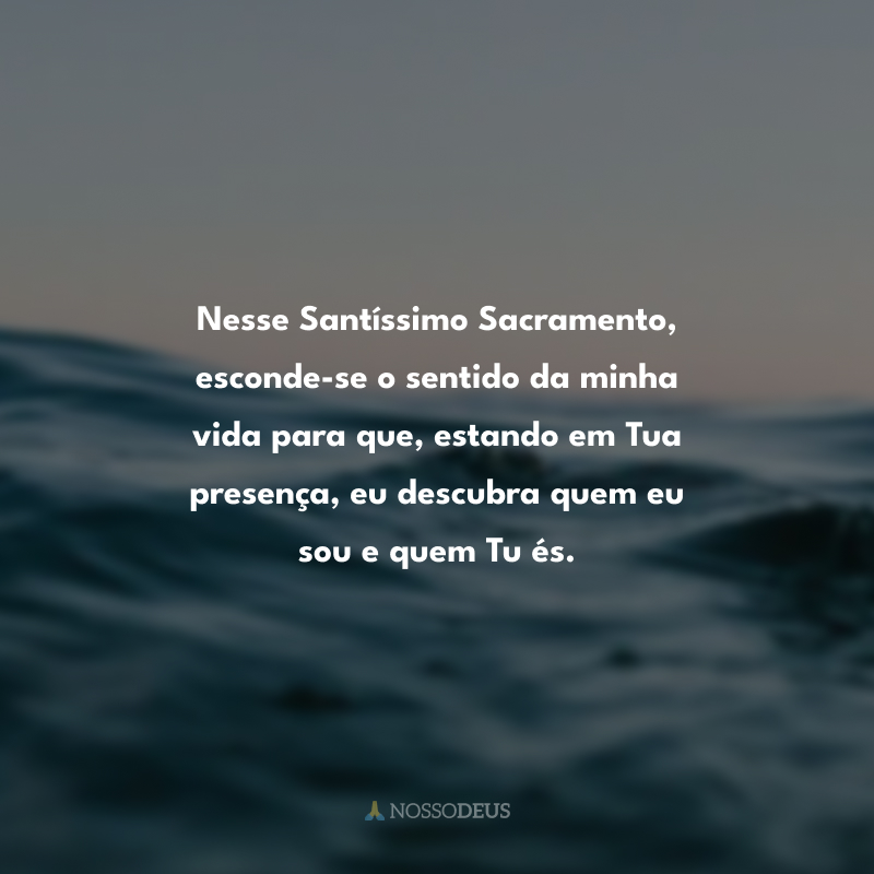 Nesse Santíssimo Sacramento, esconde-se o sentido da minha vida para que, estando em Tua presença, eu descubra quem eu sou e quem Tu és. Na aparência de pão, alimenta minha alma de sentido. Eu Te agradeço por ter se feito tão pequeno para me tornar maior e melhor que poderia ser.