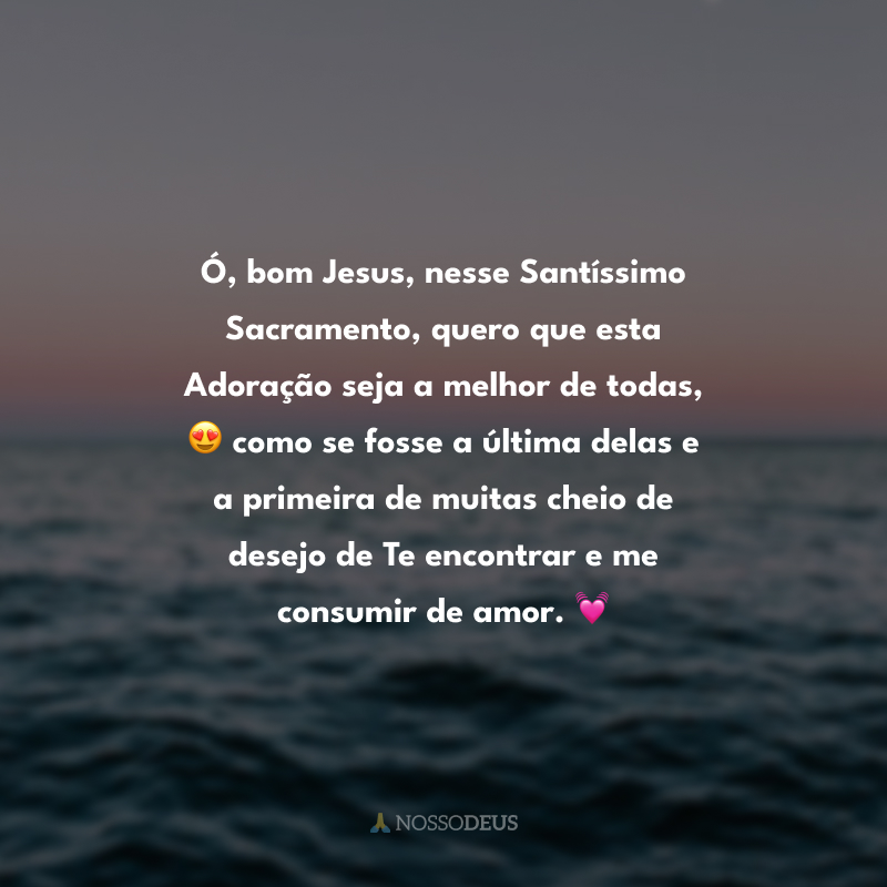 Ó, bom Jesus, nesse Santíssimo Sacramento, quero que esta Adoração seja a melhor de todas,😍 como se fosse a última delas e a primeira de muitas cheio de desejo de Te encontrar e me consumir de amor. 💓 Firma em mim este propósito de me unir a Ti não apenas agora, como em todos os dias da minha vida.